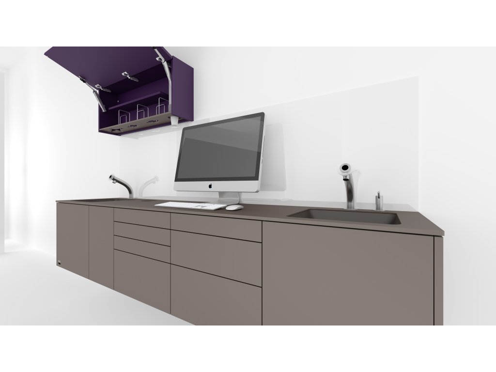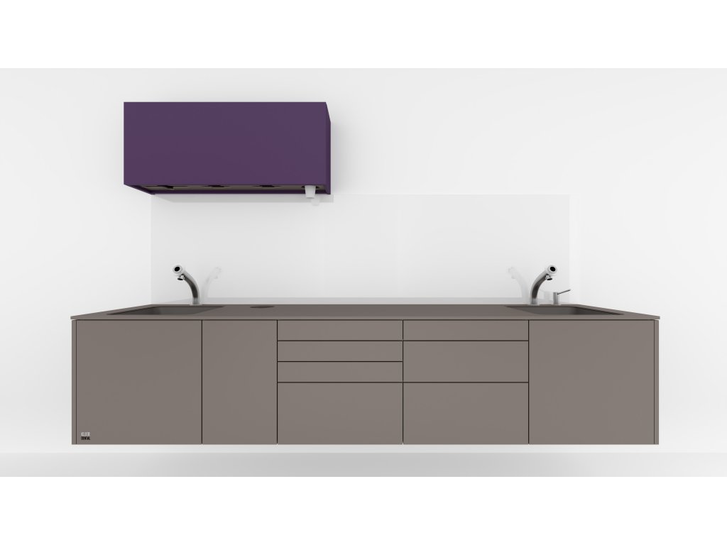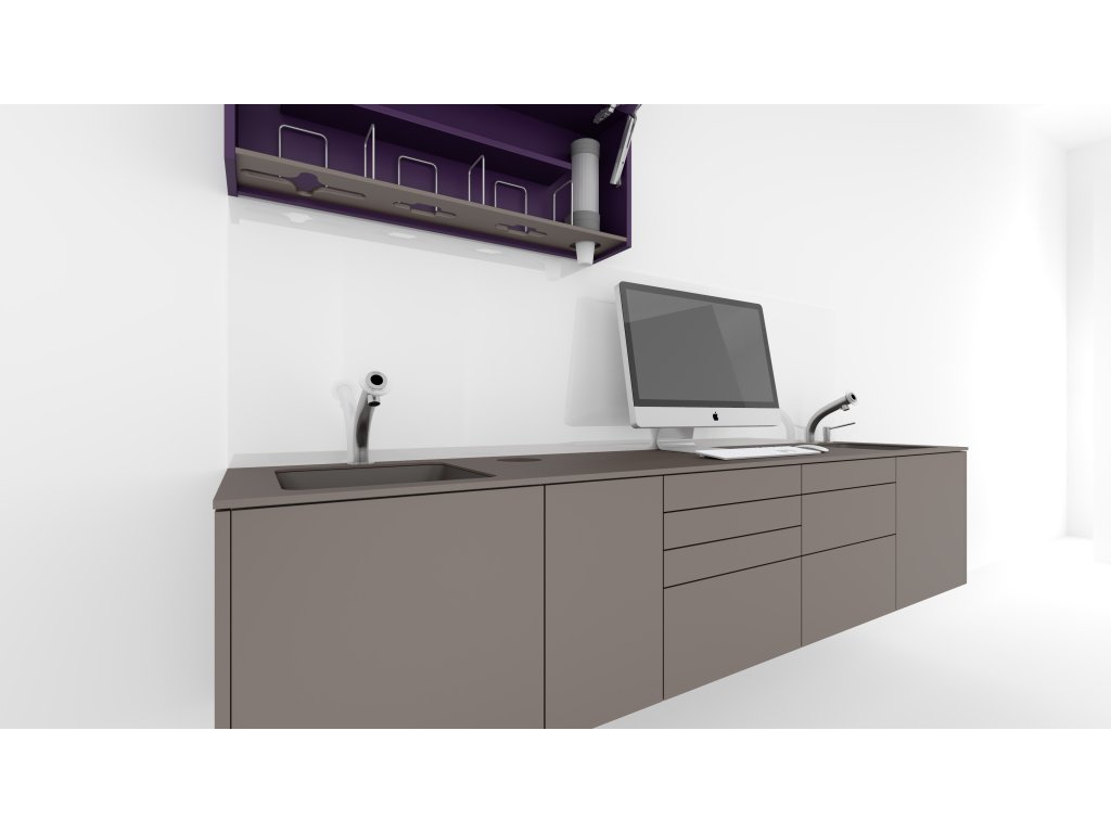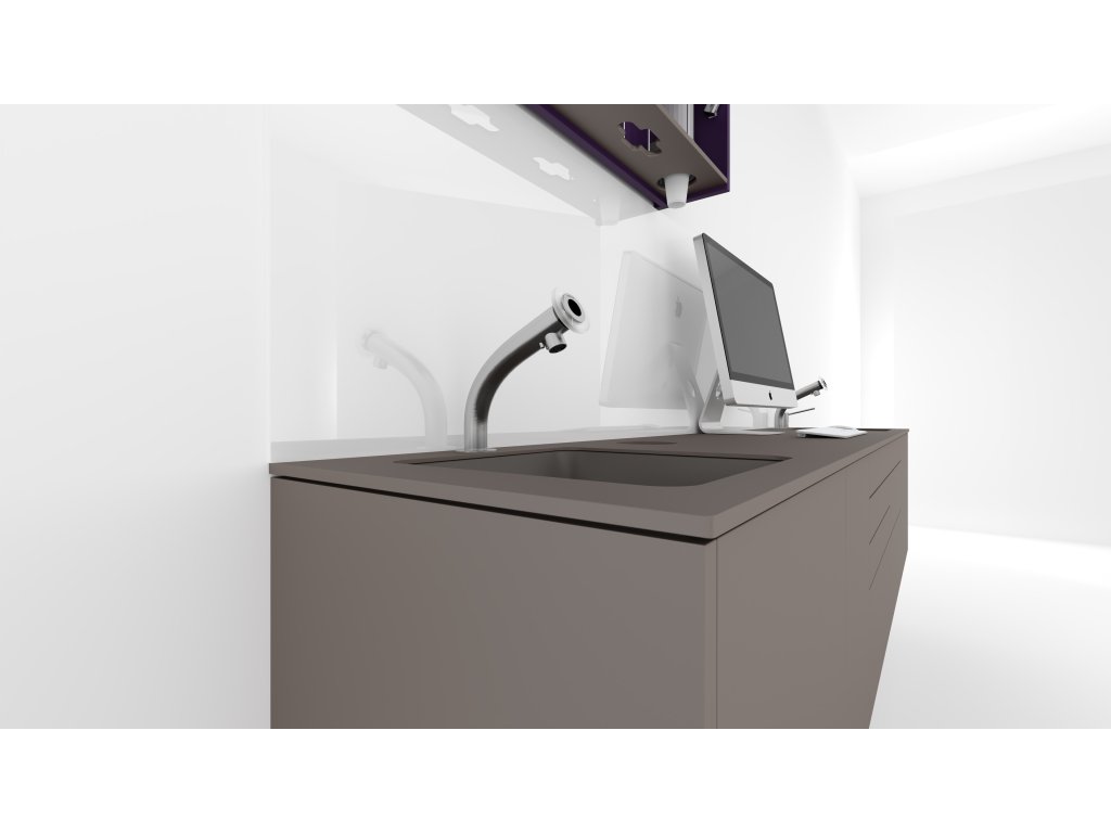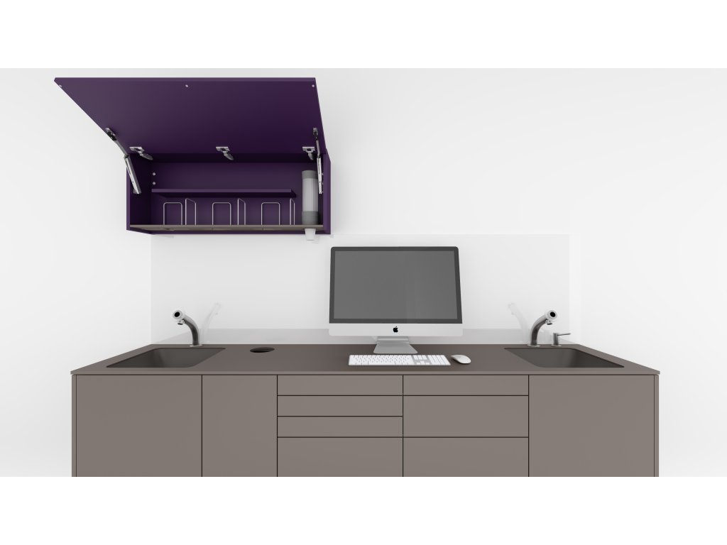 Závěsný nábytkový systém TERRA v provedení ultramat. Pracovní deska je vyrobena z kompaktní desky hnědo-šedé barvy. Jedná se o vynikající, vysoce odolný materiál, který poskytuje pevnost, dlouhou životnost, je nenasákavý, odolný vůči nárazům a poškrábání, vysokým teplotám, UV záření, je antibakteriální a dezinfikovatelný. Materiál je vyvinutý pro prostředí s vysokými nároky na hygienu a estetickou úroveň, vhodný do zdravotnických zařízení. Pracovní deska je v tloušťce 12 mm. Spodní skříňky využívají zásuvky Legrabox společnosti Blum s plnovýsuvy a bezúchytkovým otevíráním Tip - on. Jedná se o mechanický způsob bezúchytkového otevírání od společnosti Blum. Bezúchytková čílka se otevírají jakoby sama od sebe – stačí na ně jen zlehka zatlačit. Dřezové skříňky s výsuvným košem disponují automatickým, kolenním otevíráním Servodrive. Součástí spodní sestavy je i odpadová skříňka s odpadovou nádobou, v pracovní desce bylo myšleno na otvor pro vhazování odpadu.