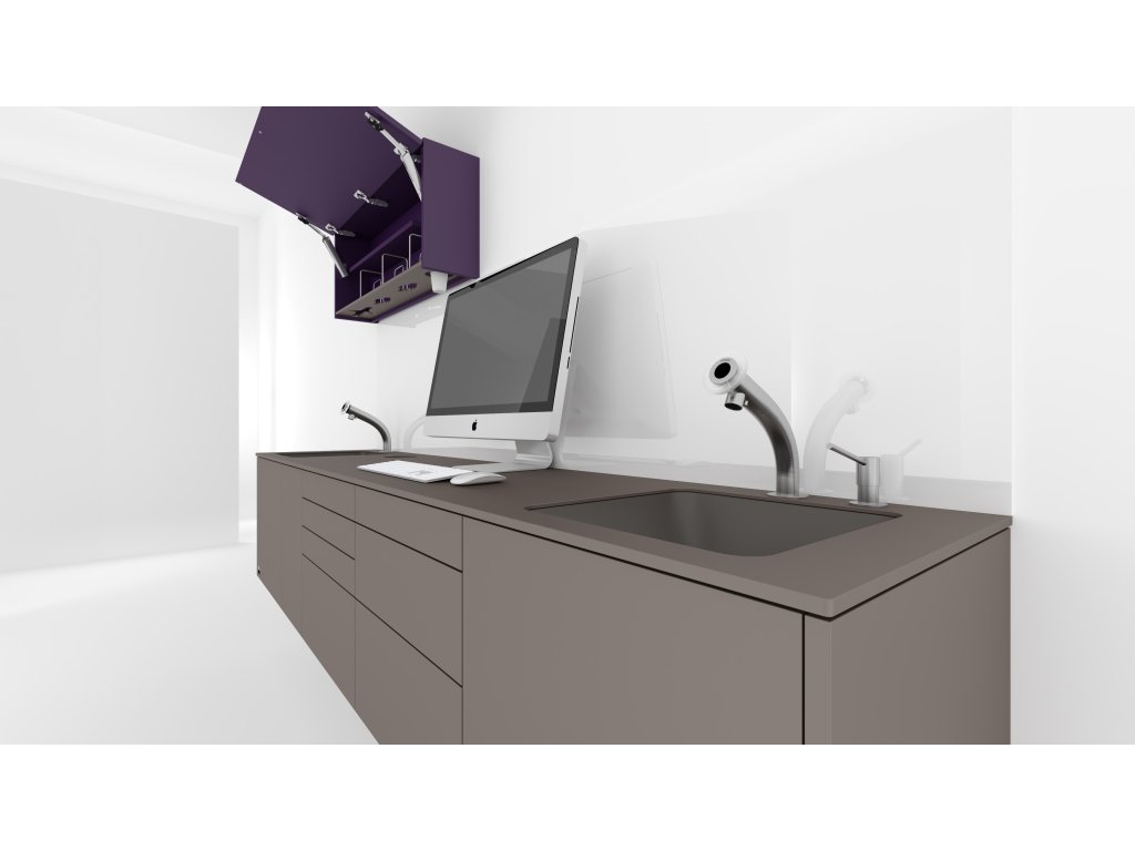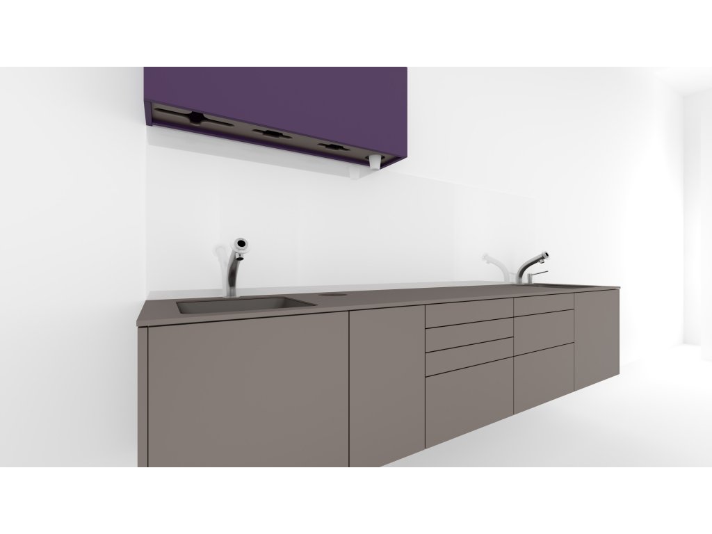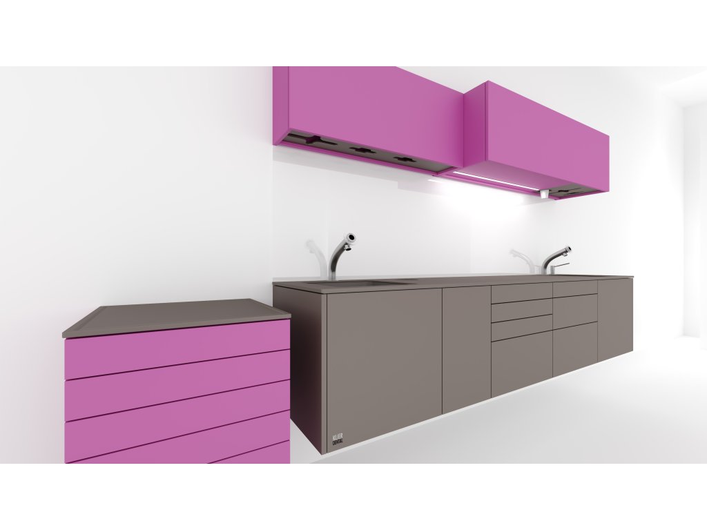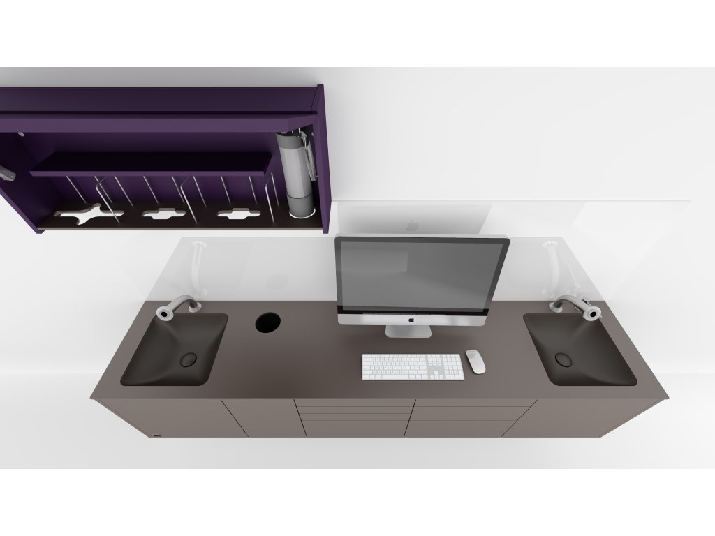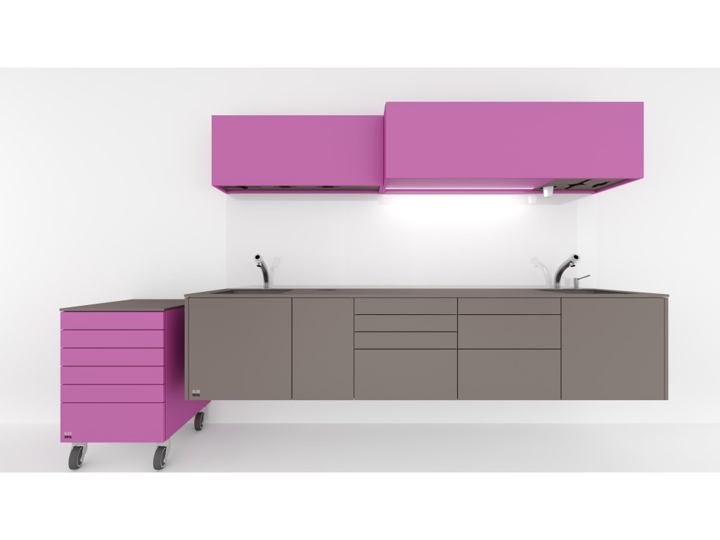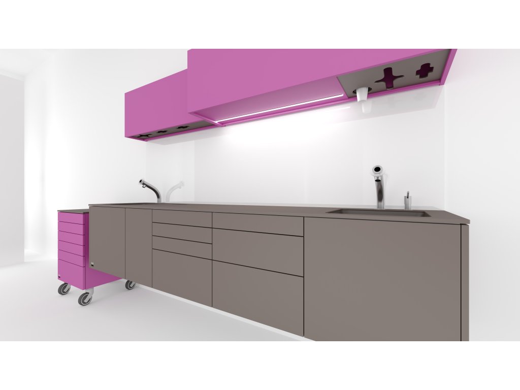 Závěsný nábytkový systém TERRA v provedení ultramat. Pracovní deska je vyrobena z kompaktní desky hnědo-šedé barvy. Jedná se o vynikající, vysoce odolný materiál, který poskytuje pevnost, dlouhou životnost, je nenasákavý, odolný vůči nárazům a poškrábání, vysokým teplotám, UV záření, je antibakteriální a dezinfikovatelný. Materiál je vyvinutý pro prostředí s vysokými nároky na hygienu a estetickou úroveň, vhodný do zdravotnických zařízení. Pracovní deska je v tloušťce 12 mm. Spodní skříňky využívají zásuvky Legrabox společnosti Blum s plnovýsuvy a bezúchytkovým otevíráním Tip - on. Jedná se o mechanický způsob bezúchytkového otevírání od společnosti Blum. Bezúchytková čílka se otevírají jakoby sama od sebe – stačí na ně jen zlehka zatlačit. Dřezové skříňky s výsuvným košem disponují automatickým, kolenním otevíráním Servodrive. Součástí spodní sestavy je i odpadová skříňka s odpadovou nádobou, v pracovní desce bylo myšleno na otvor pro vhazování odpadu.
