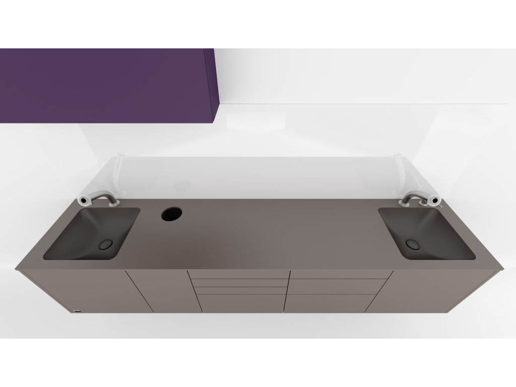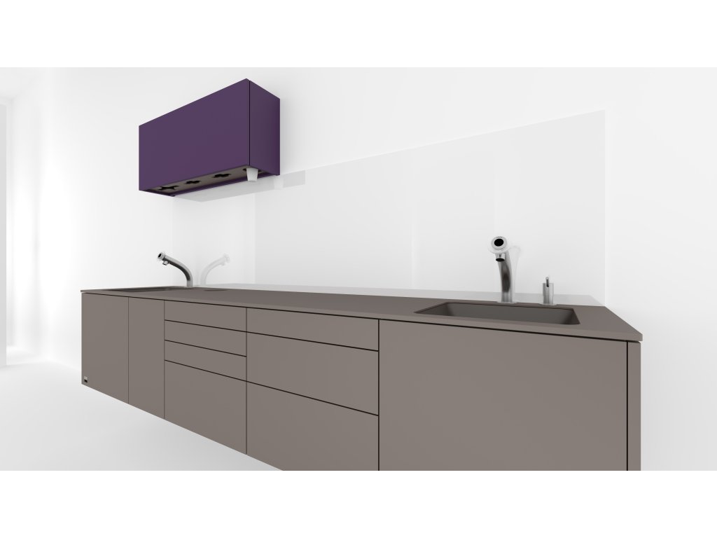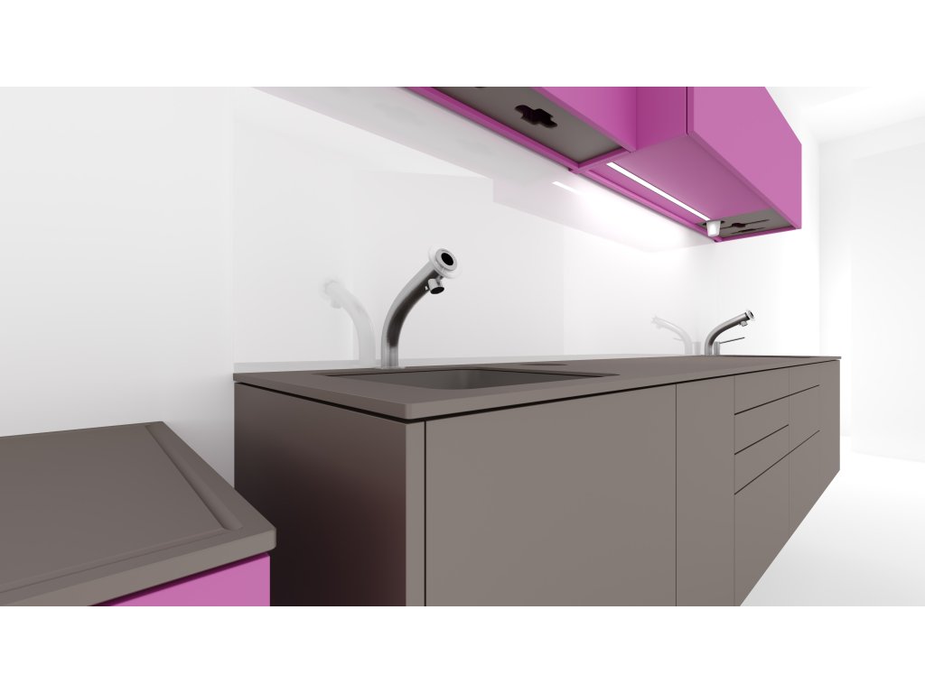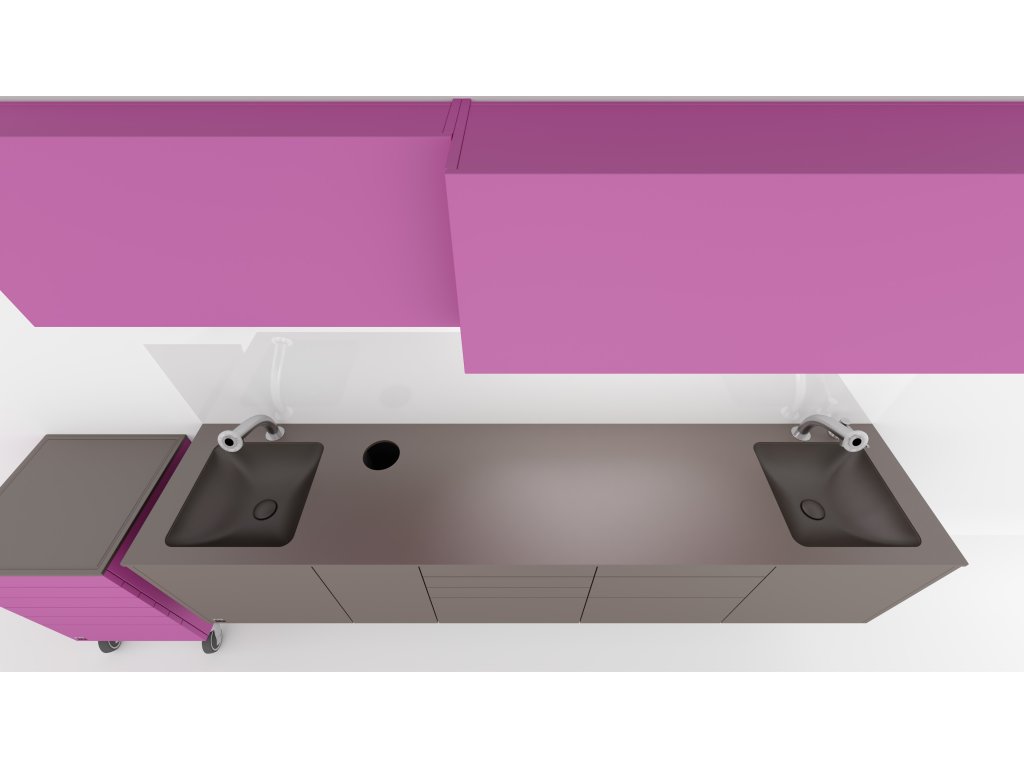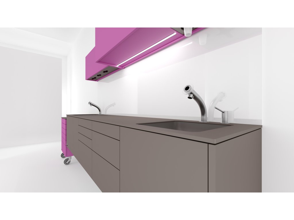 Závěsný nábytkový systém TERRA v provedení ultramat. Pracovní deska je vyrobena z kompaktní desky hnědo-šedé barvy. Jedná se o vynikající, vysoce odolný materiál, který poskytuje pevnost, dlouhou životnost, je nenasákavý, odolný vůči nárazům a poškrábání, vysokým teplotám, UV záření, je antibakteriální a dezinfikovatelný. Materiál je vyvinutý pro prostředí s vysokými nároky na hygienu a estetickou úroveň, vhodný do zdravotnických zařízení. Pracovní deska je v tloušťce 12 mm. Spodní skříňky využívají zásuvky Legrabox společnosti Blum s plnovýsuvy a bezúchytkovým otevíráním Tip - on. Jedná se o mechanický způsob bezúchytkového otevírání od společnosti Blum. Bezúchytková čílka se otevírají jakoby sama od sebe – stačí na ně jen zlehka zatlačit. Dřezové skříňky s výsuvným košem disponují automatickým, kolenním otevíráním Servodrive. Součástí spodní sestavy je i odpadová skříňka s odpadovou nádobou, v pracovní desce bylo myšleno na otvor pro vhazování odpadu.