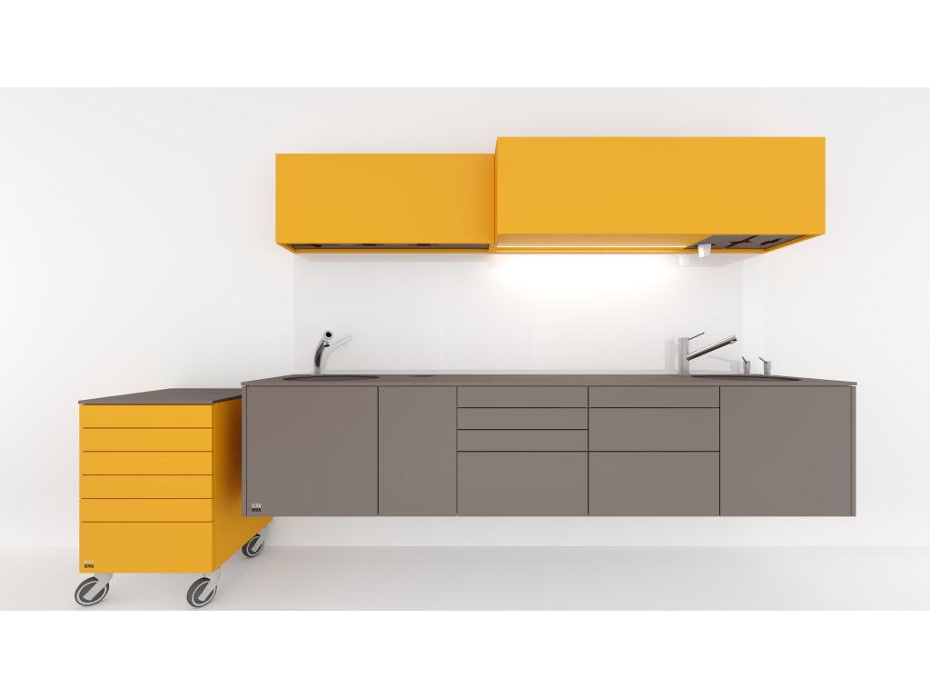 Kombinujte horní hygienickou skříňku s vhodnou spodní sestavou dentálního nábytku, mobilním asistentem nebo kancelářským stolem ve stejném designu TERRA.